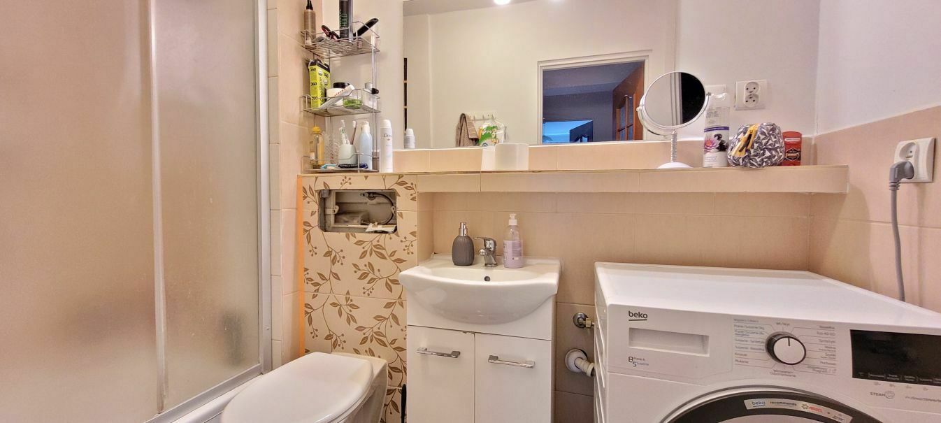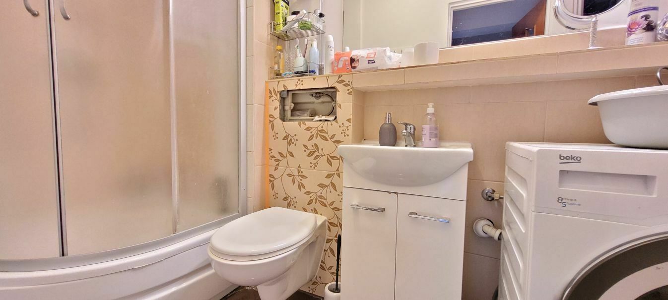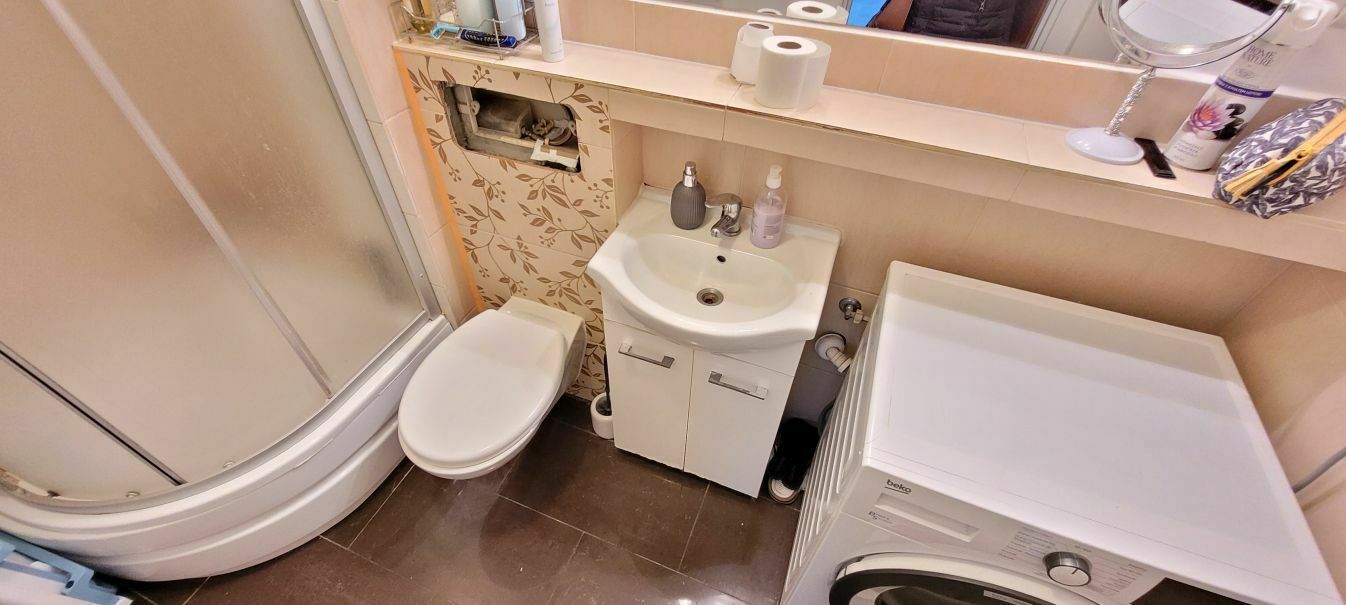 - łazienka z kabiną prysznicową, toaletą i miejscem na pralkę