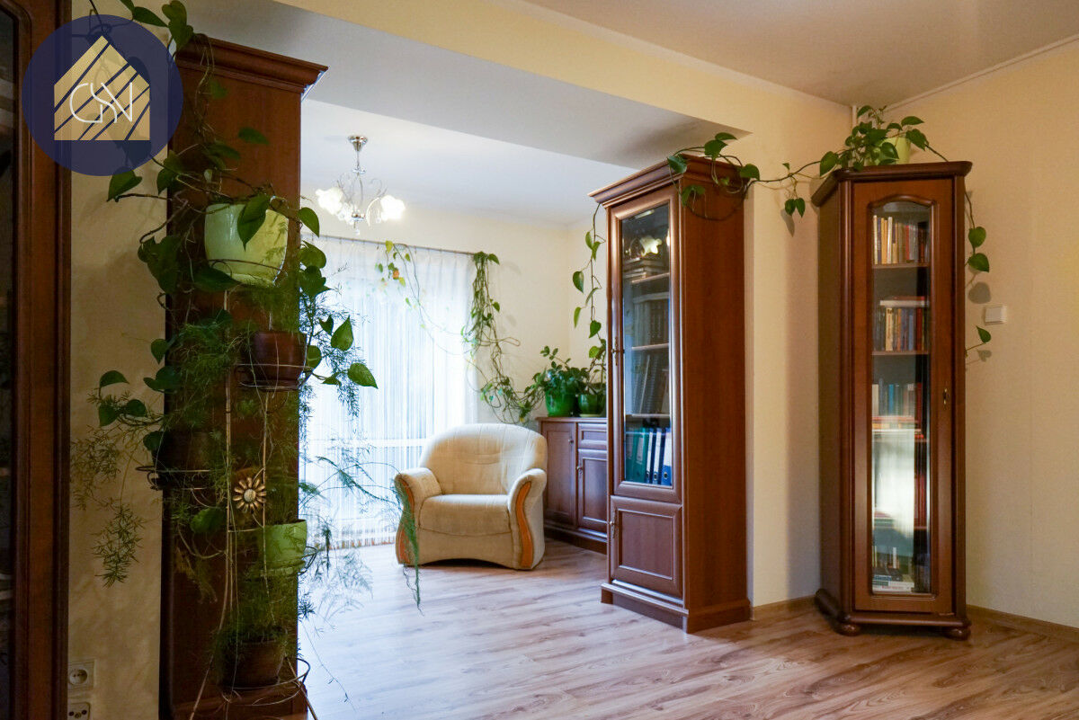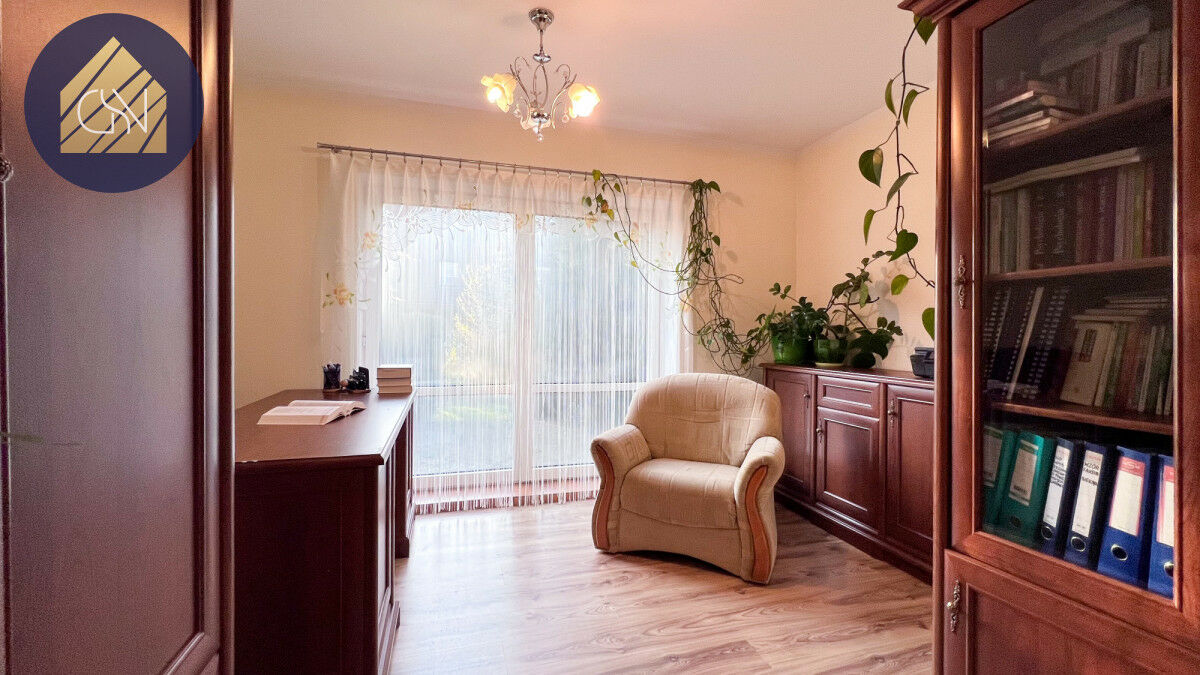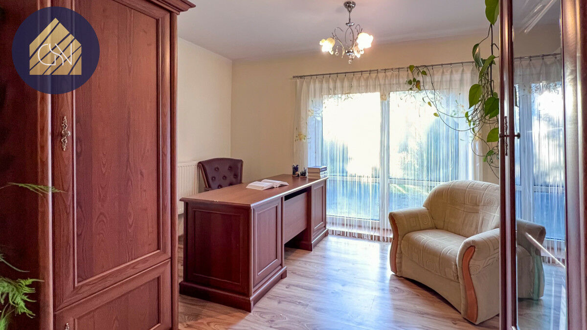 Na 1 kondygnacji znajduje się bardzo duży hol z kominkiem, który może pełnić rolę pomieszczenia gościnnego lub być lobby dla gości. Duży pokój, który może być podzielony na dwa z wyjściem na taras i do ogrodu jest rewelacyjnym miejscem na gabinet lub oddzielny apartament, gdyż tuż obok jest duża kuchnia z jadalnia i łazienka. Jest możliwość oddzielenia tej części i stworzenia 2 pokoi z własną kuchnią, łazienką i pomieszczeniem wspólnym.