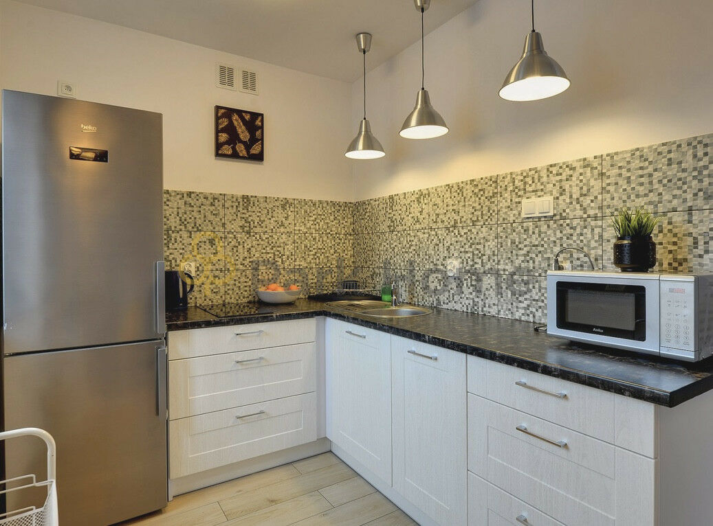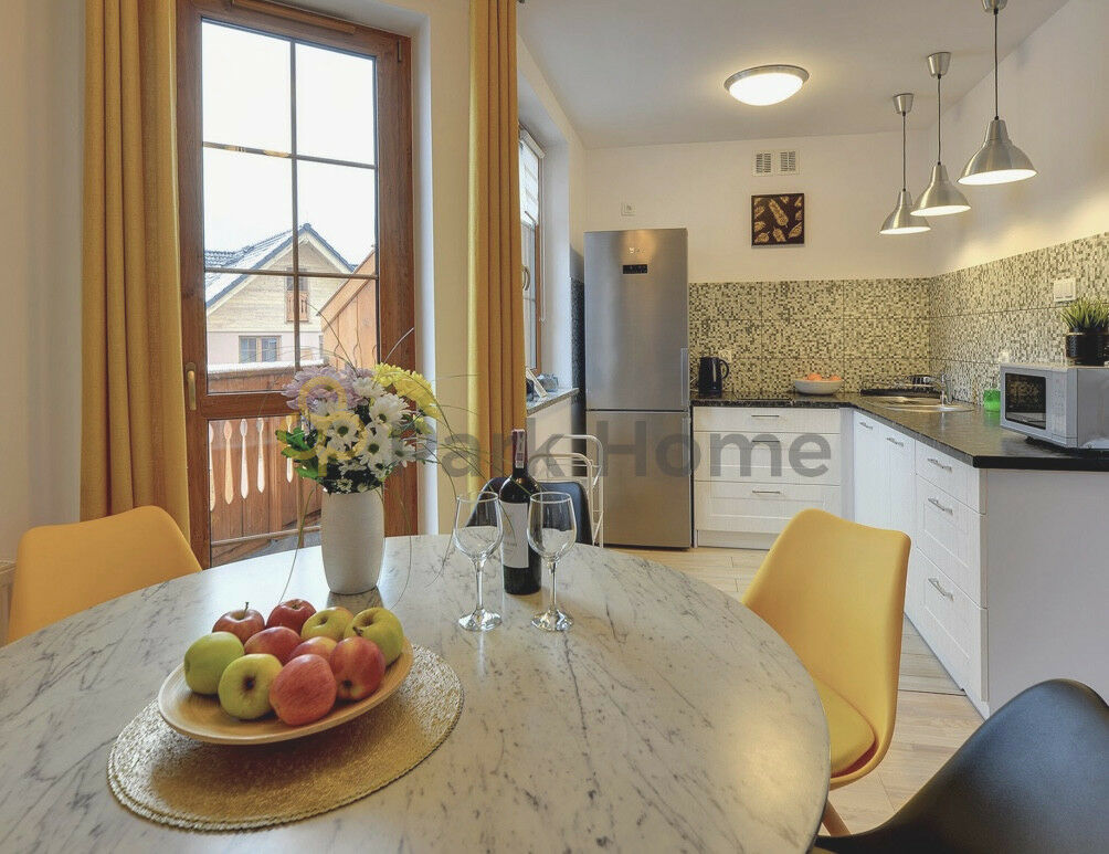 Kuchnia wyposażona jest w komplet naczyń, sztućców i garnków, dużą lodówkę, kuchenkę mikrofalową, czajnik elektryczny oraz ekspres do kawy. W lokalu znajduje się również pralka, odkurzacz, żelazko, deska do prasowania, suszarka na ubrania oraz suszarka do włosów. W salonie rozkładana sofa zwiększająca liczbę miejsc noclegowych.
