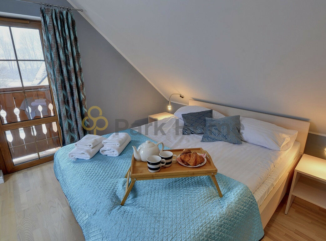 Na poziomie dolnym znajduje się przestronny salon z aneksem kuchennym i częścią jadalnianą, sypialnia z dwoma oddzielnymi łóżkami oraz łazienka z kabiną prysznicową. Z salonu wyjście na balkon.