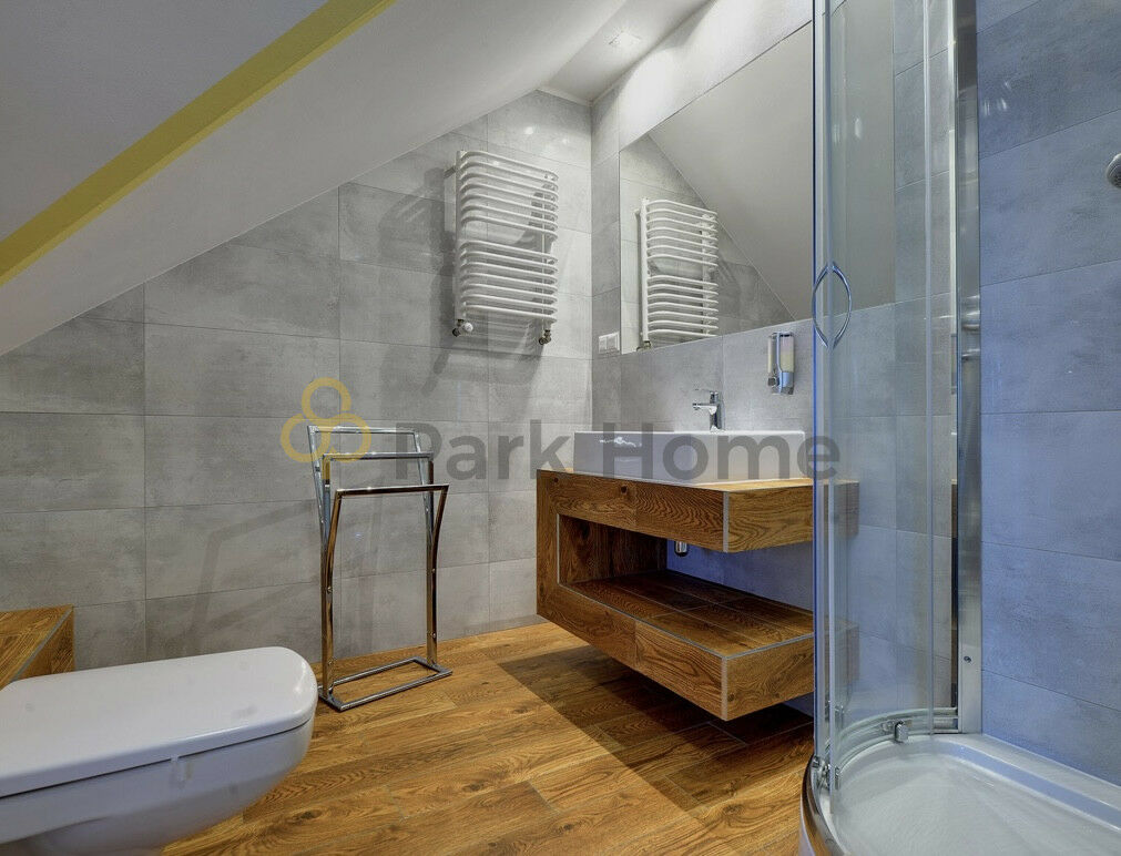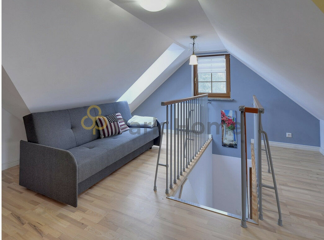 Na piętrze zlokalizowana jest sypialnia z łóżkiem małżeńskim oraz druga łazienka z prysznicem.