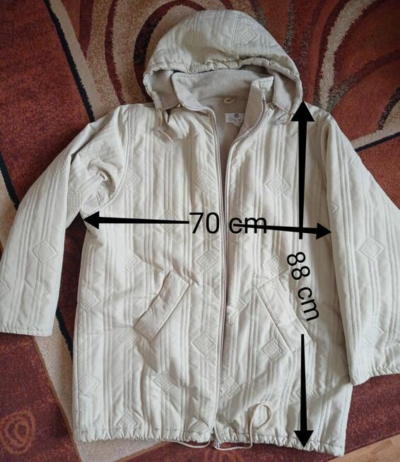 Nowy!!!!! kożuszek z kapturem.Ani razu nie ubrany.Prezent za mały.Rozmiar L. Wymiary..długość około 100 cm.biust 98 ...